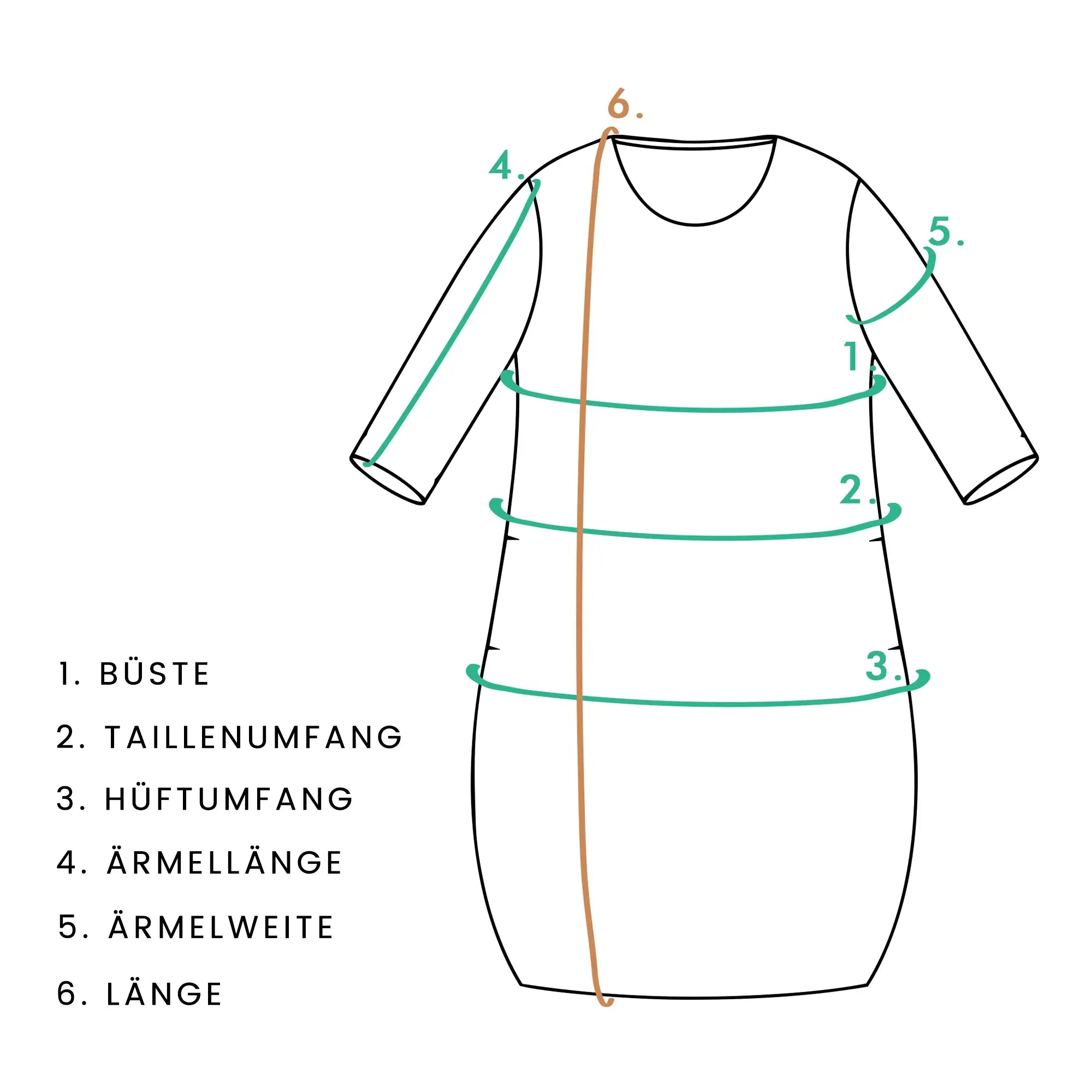 | Größe | Buste (CM) | Taille (CM) | Hüfte (CM) | Ärmellänge (CM) | Ärmelbreite (CM) | Länge (CM) |