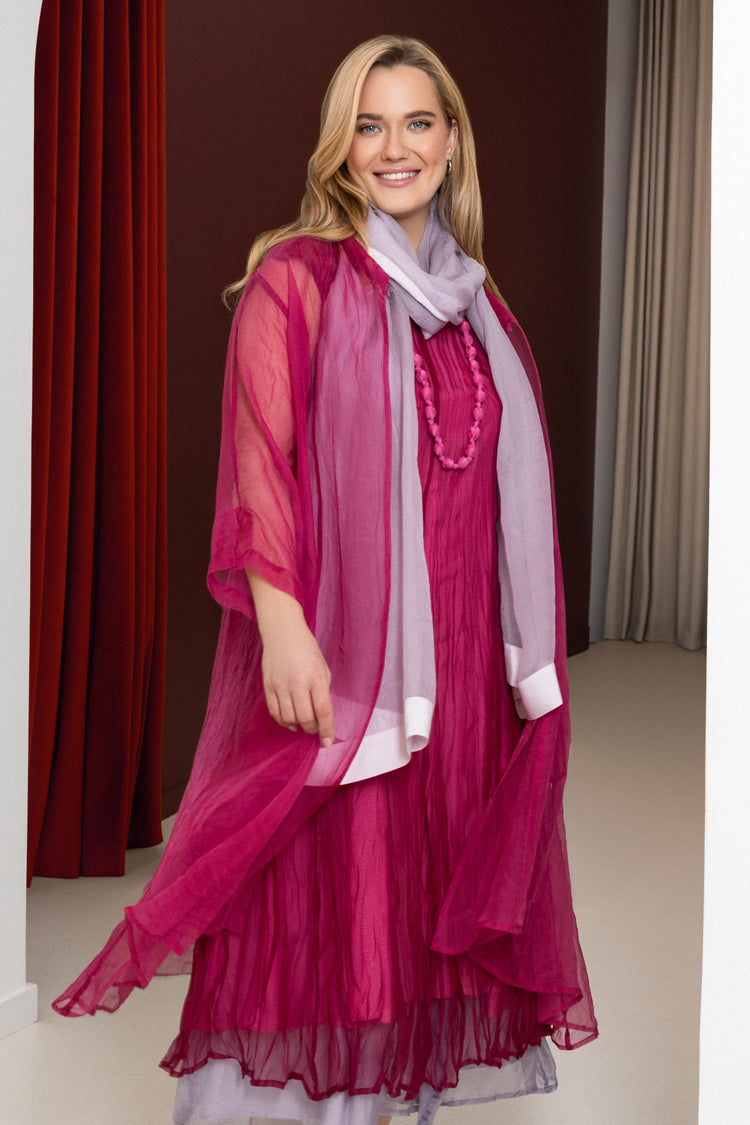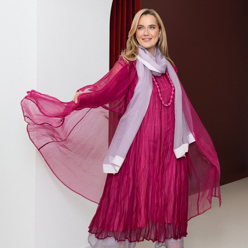 Genießen Sie mühelose Leichtigkeit mit dieser Seidenchiffonjacke, die sich ideal für fließende, elegante Lagenlooks eignet. Der transparente, luftige Stoff fällt sanft und unterstreicht die entspannte Silhouette mit subtiler Bewegung. Die Jacke ist vielseitig einsetzbar – ob elegant oder leger – und verleiht jedem Outfit zu verschiedenen Anlässen eine dezente Eleganz.
