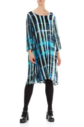 Fließendes Kleid aus dehnbarem Seidensamt mit blauen Linien