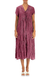 Dieses zeitlose Kleid mit schmeichelhaftem V-Ausschnitt, Falten vorne und Midilänge wird aus reiner, luxuriöser Seide in einem geknitterten, plissierten Effekt handgefertigt. Es ist ein echtes Basic für jeden Tag und jeden Anlass.