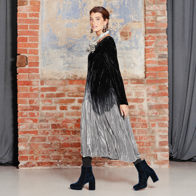 The jacket is crafted from luxurious silk velvet fabric in a black colour. The unique asymmetric collar neck, embellished with a single side button and flared shape with a longer back hemline make the jacket great to wear and easy to style: perfect for any occasion.