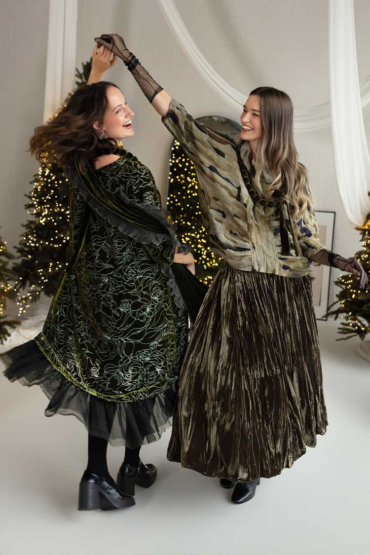 The jacket offers a luxurious touch with its intricate feather devoré pattern and rich hue. Its soft drape and buttoned front create an elegant layering piece, perfect for elevating any ensemble.