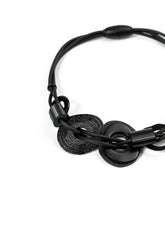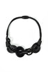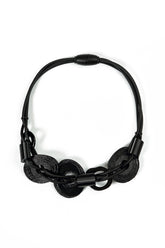Let this necklace become your serene, sculptural touch of style. The combination of soft black rubber with glossy vinyl accents and natural tagua pieces creates a perfectly balanced geometric look. It sits beautifully around the neckline and instantly elevates even the simplest outfit with artistic depth and sophistication.