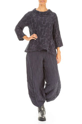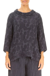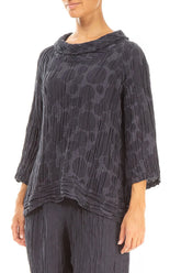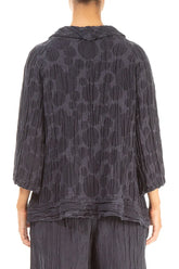 Chemisier en soie et lin bleu ardoise à manches courtes et à motifs circulaires, manches courtes