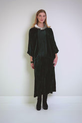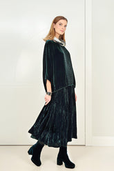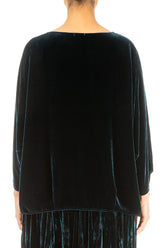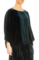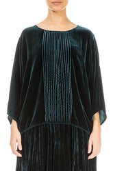 Confectionné en velours de soie somptueux, ce chemisier présente une silhouette fluide et décontractée, des manches dolman souples et un devant légèrement plissé pour une allure naturelle. D'une grande polyvalence, il se superpose avec élégance à un pantalon ou une jupe pour un look à la fois raffiné et facile à porter.