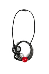 Ce collier à spirale métallique et sphère rouge allie fluidité et contraste audacieux, créant un bijou à la fois ludique et sophistiqué. La sphère rouge brillant capte magnifiquement la lumière, tandis que les spirales métalliques apportent mouvement et texture. Portez-le avec des hauts ou des robes minimalistes pour en faire la pièce maîtresse de votre tenue.
