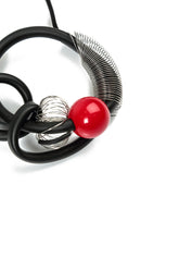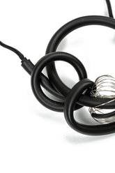 - Boucles sculpturales en caoutchouc noir mêlées à des spirales en métal poli