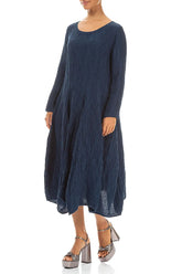 Robe évasée en lin et soie bleu marine froissé