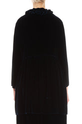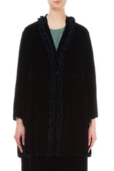 Cette veste allie luxe et savoir-faire. Sa coupe légèrement cintrée au niveau du buste flatte la silhouette, tandis que sa longueur s'évase en un drapé plus ample à l'ourlet pour un confort optimal. De délicats volants ajoutent une touche romantique, et sa teinte riche souligne son charme intemporel.
